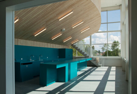 While the architectural aficionado may admire the clever geometry and the quality of the finishes, for the users of the building it will simply be a bright and welcoming space, and one that is very easy to read. As the inhabitants of the two schools come together, there is no danger of them getting lost in their new environment. This is exactly the way that the architect wants it to be seen. ‘There is a close relationship between the building, the architecture and the users,’ said Poolen.