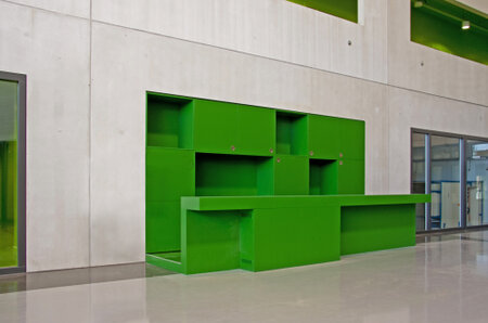 Anybody who fears that this cooperative and flexible approach would result in a bland building, need only look at Het Perron to be disabused. Set on a triangular site, it brings together two different schools (‘Het Perron’ means ‘the platform’ and it is providing a common platform for education). This is symbolised by a design that looks as if two buildings are crashing into each other, with the corner of one protruding over the flat face of the other. The two ‘buildings’ (in fact of course only one) are differentiated by the cladding, with one in a plain anodised aluminium, and the other in shaded bands of red and brown, vaguely reminiscent of a bar code but less frenetic. It uses four different colours and is in fact, says Poolen, ‘the pattern of a heartbeat’. The building had a low budget, and so made use entirely of available materials, avoiding the use of specials. The cladding was no exception, so that the colours used were all standard colours, although employed in a non standardised fashion.